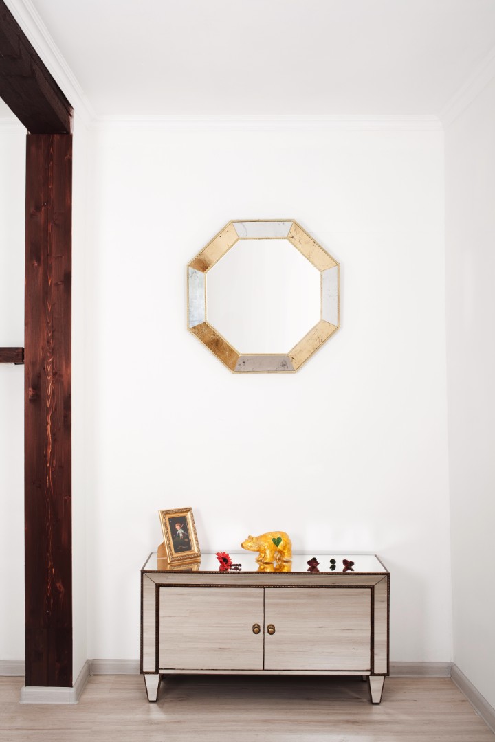 Эксклюзивное зеркало ручной работы выполнено в форме роскошного золотого бриллианта с золотой состаренной каймой. Над его созданием кропотливо трудились руки самых искусных мастеров. Благодаря гармоничному сочетанию классического, золотого поталевого и серебряного поталевого зеркал обыкновенный предмет интерьера превратился в настоящее произведение искусства. Зеркало идеально дополнит пространство прихожей, а также станет центральным элементом в оформлении гостиной или спальни хозяев дома. По контуру рамы идет золотая состаренная окантовка.